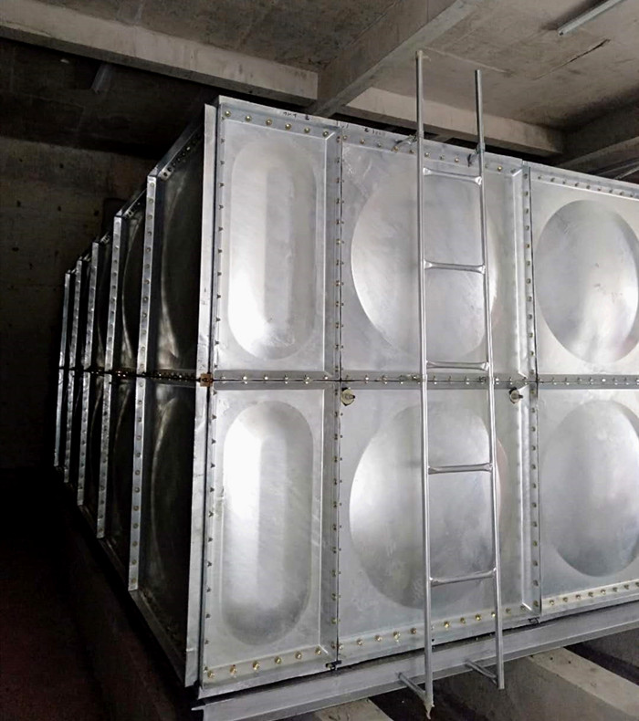鍍鋅水箱主要采用優(yōu)質的Q235鋼板沖壓而成,形成1000×1000、1000×500、500×500等標準板塊后經(jīng)熱浸鍍鋅處理后形成鍍鋅水箱板。優(yōu)點是:、全螺栓連接,現(xiàn)場進行組裝,組裝快捷方便,組裝時采用密封條密封,不易出現(xiàn)漏水及密封不嚴現(xiàn)象。第二、水箱體內(nèi)特殊性拉桿結構,使力學性能更合理,高度可達到5米。鍍鋅水箱對安裝現(xiàn)場無特殊要求,無需吊裝設備,容積可滿足用戶要求。